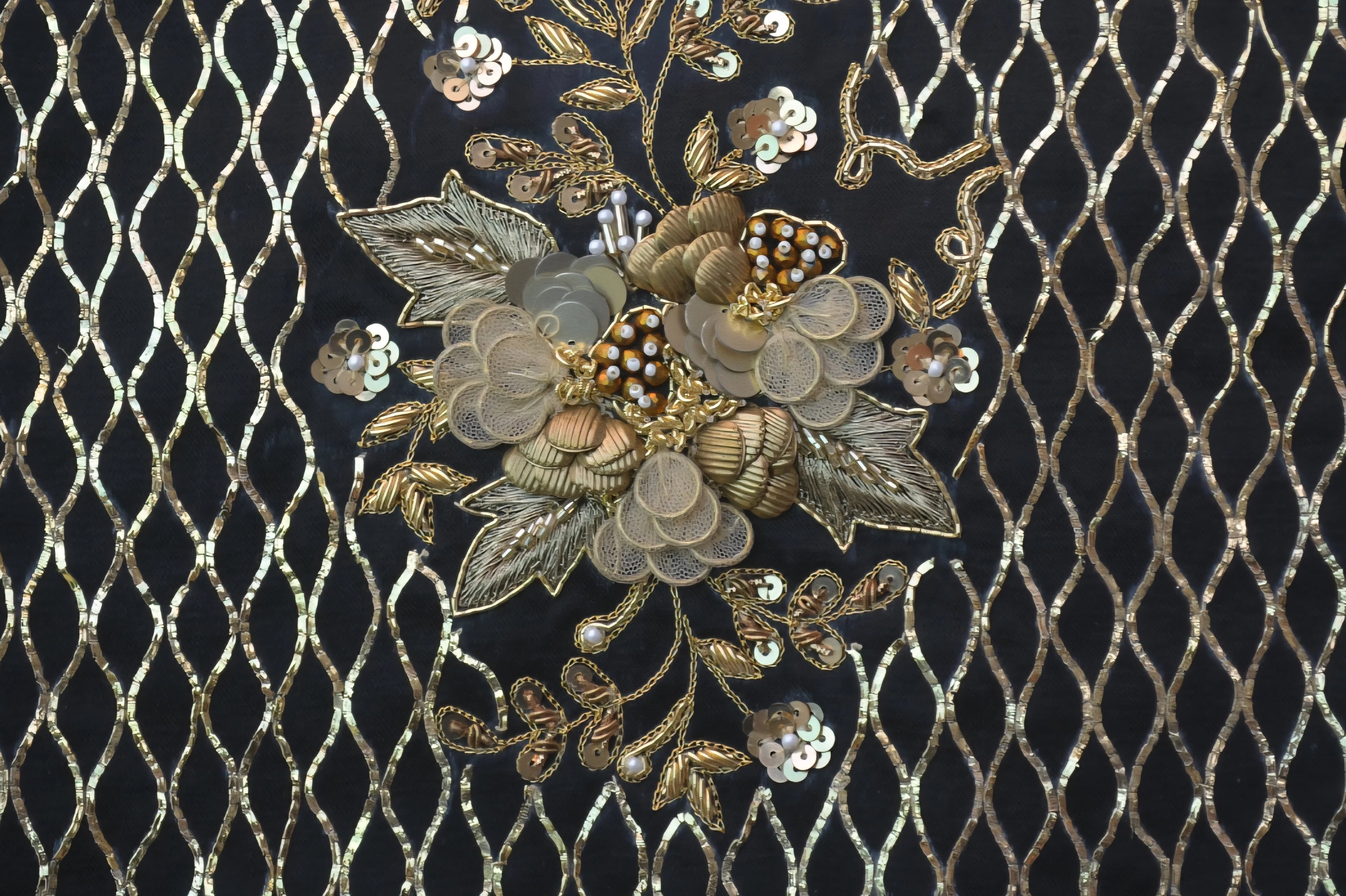 Black & Gold Pita Lattice Unstitched Blouse with 3D Floral Appliqué Round Deep Pan Neck