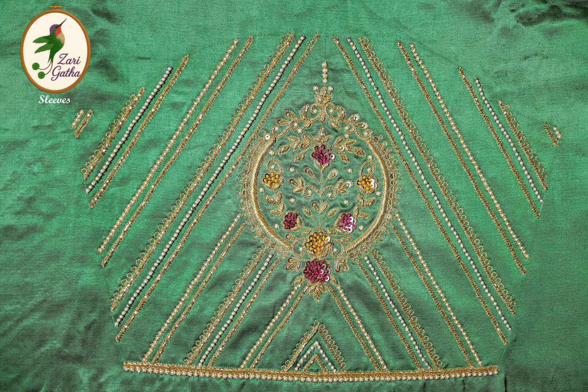 Aari work blouse design, bridal blouse with zardosi work, and designer blouse hand embroidery for wedding wear and traditional attire. Crafted from aristocratic premium silk, this luxurious blouse features a refined U-neckline and expertly embellished sleeves. The detailed aari and zardosi embroidery on the sleeves adds timeless sophistication, making it a perfect choice for festive occasions, traditional parties, and elegant weddings. Experience the graceful drape and classic charm of Indian traditional fashion with this premium designer blouse.
