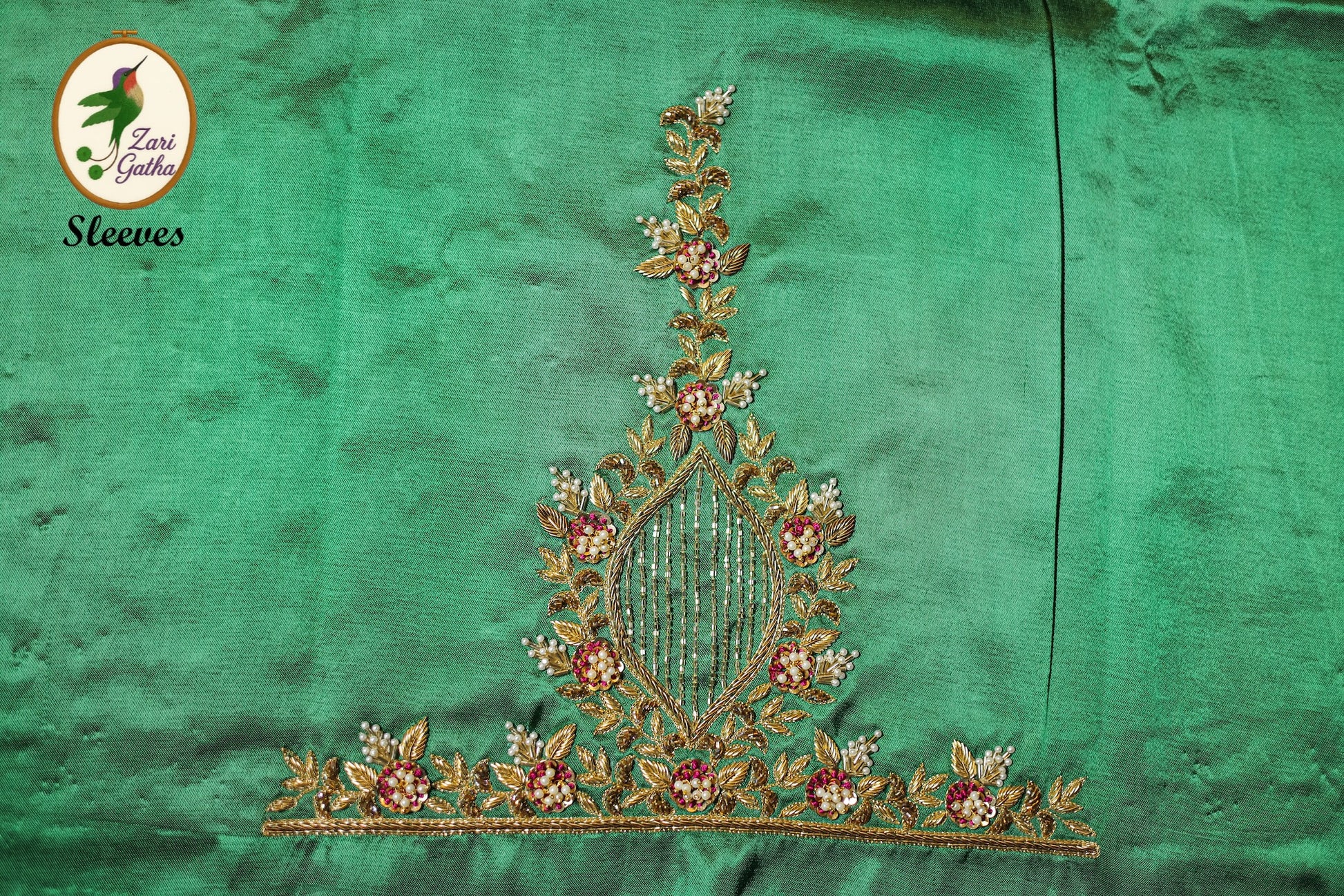 Zardosi work blouse with aari work blouse hand designs and traditional blouse back neck designs, perfect bridal blouse for festive and wedding wear.