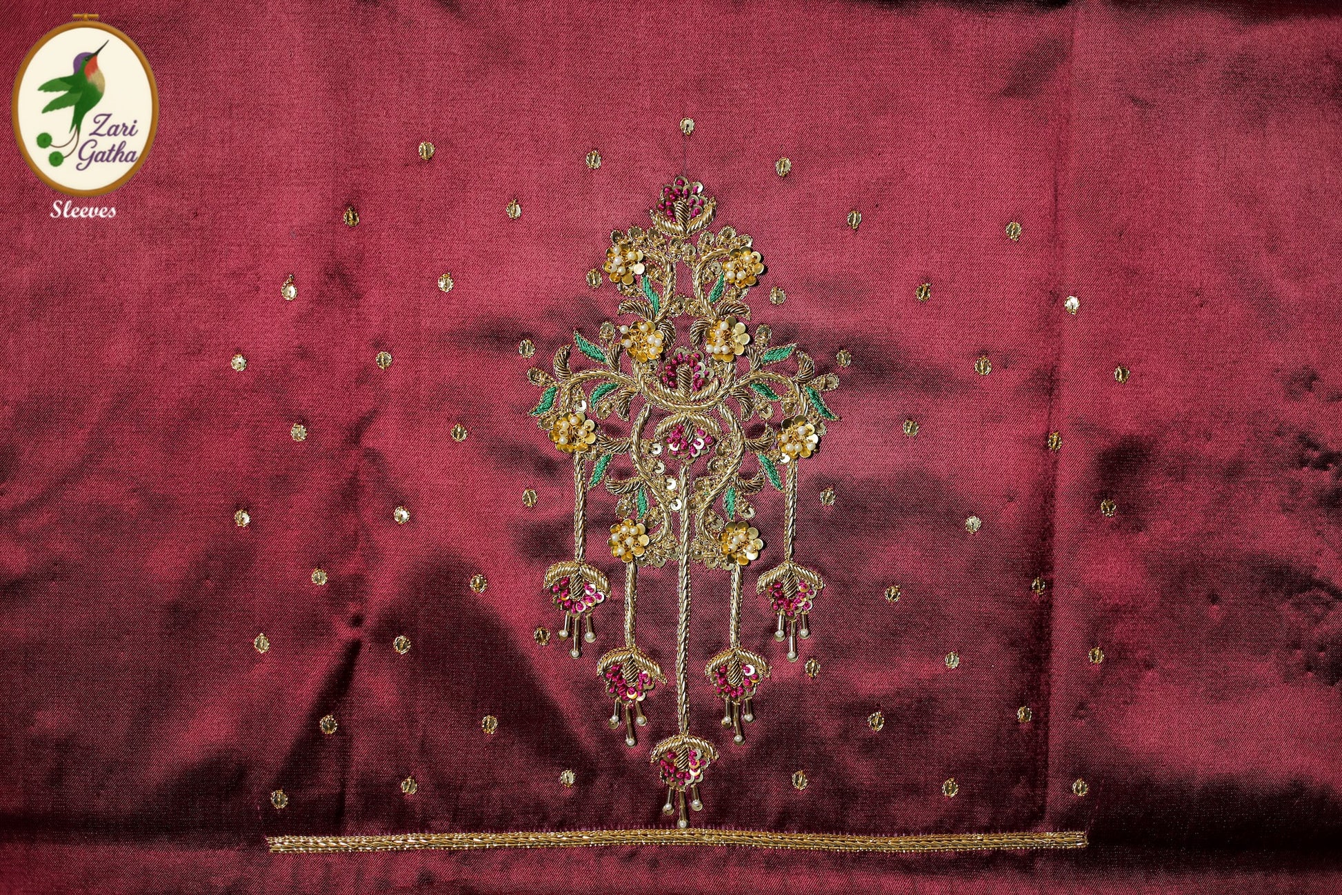 Aari work blouse hand designs with zardosi embroidery, unique blouse designs for wedding wear, and designer blouse style for lehenga and saree.
