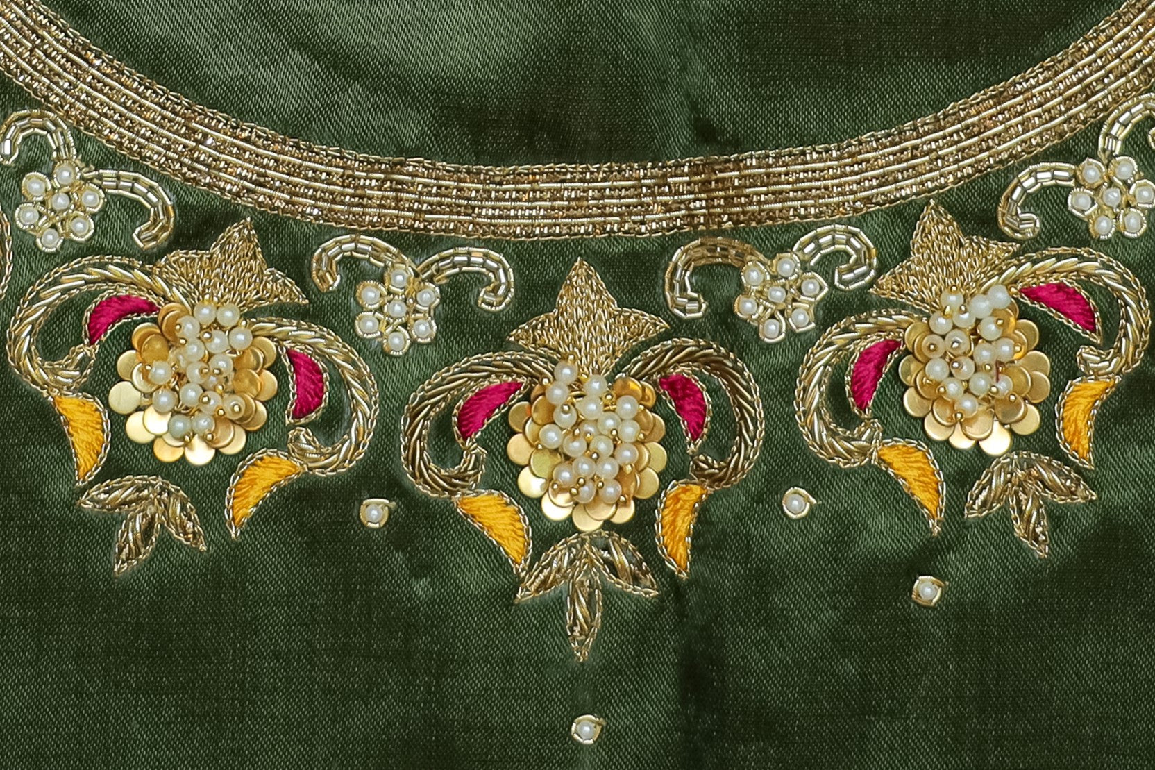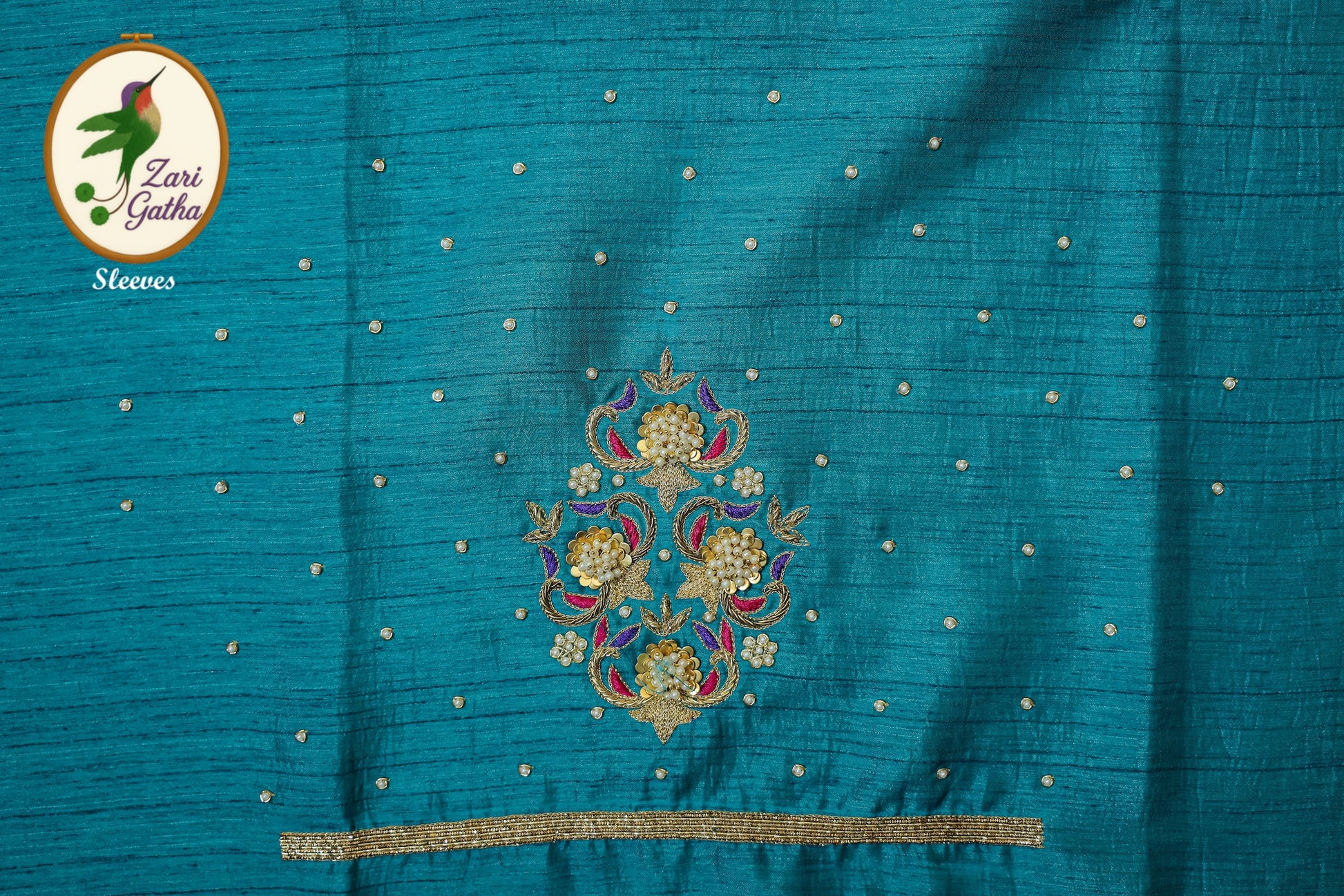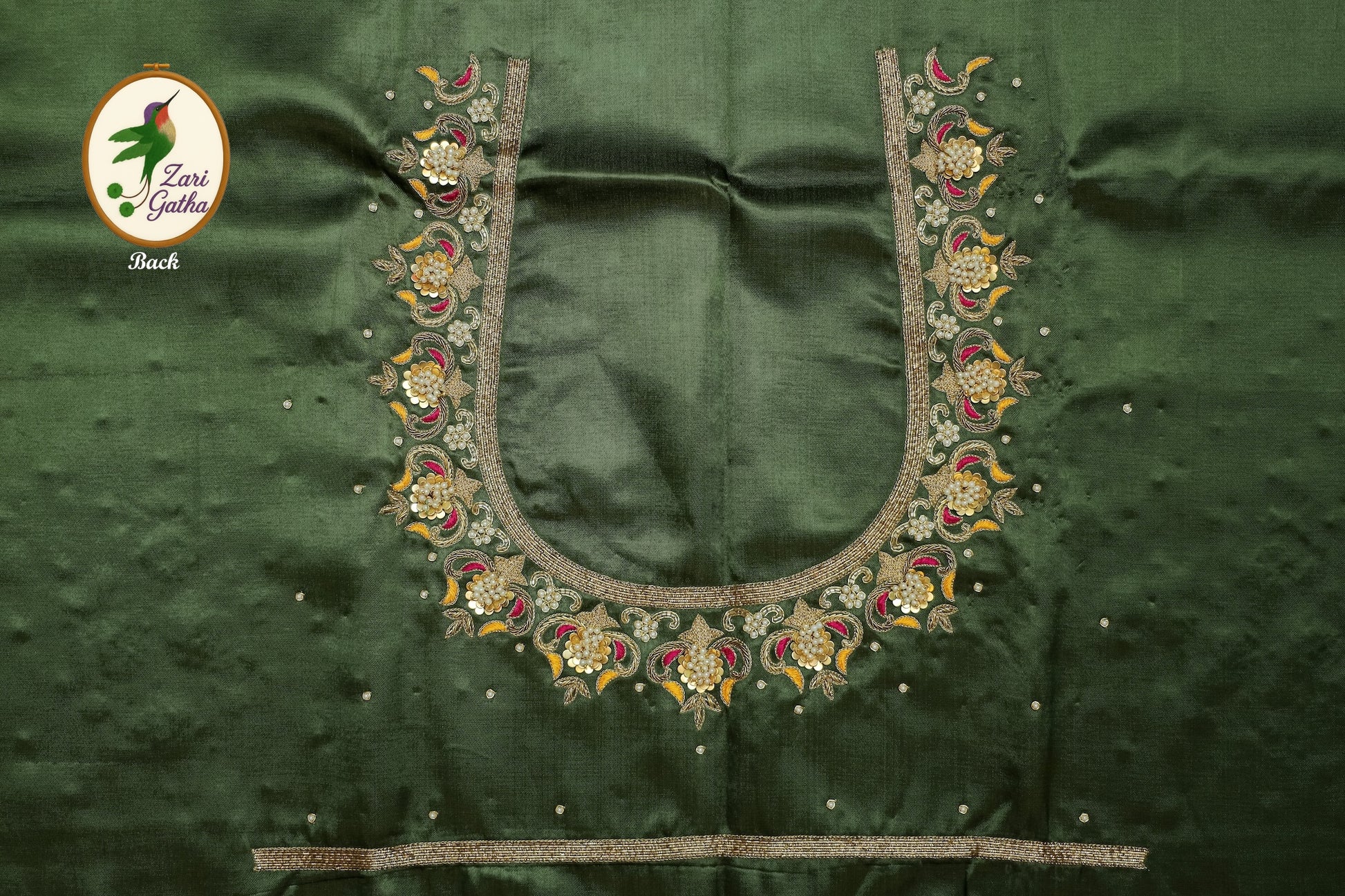 - Handcrafted embroidery with golden zari and beads