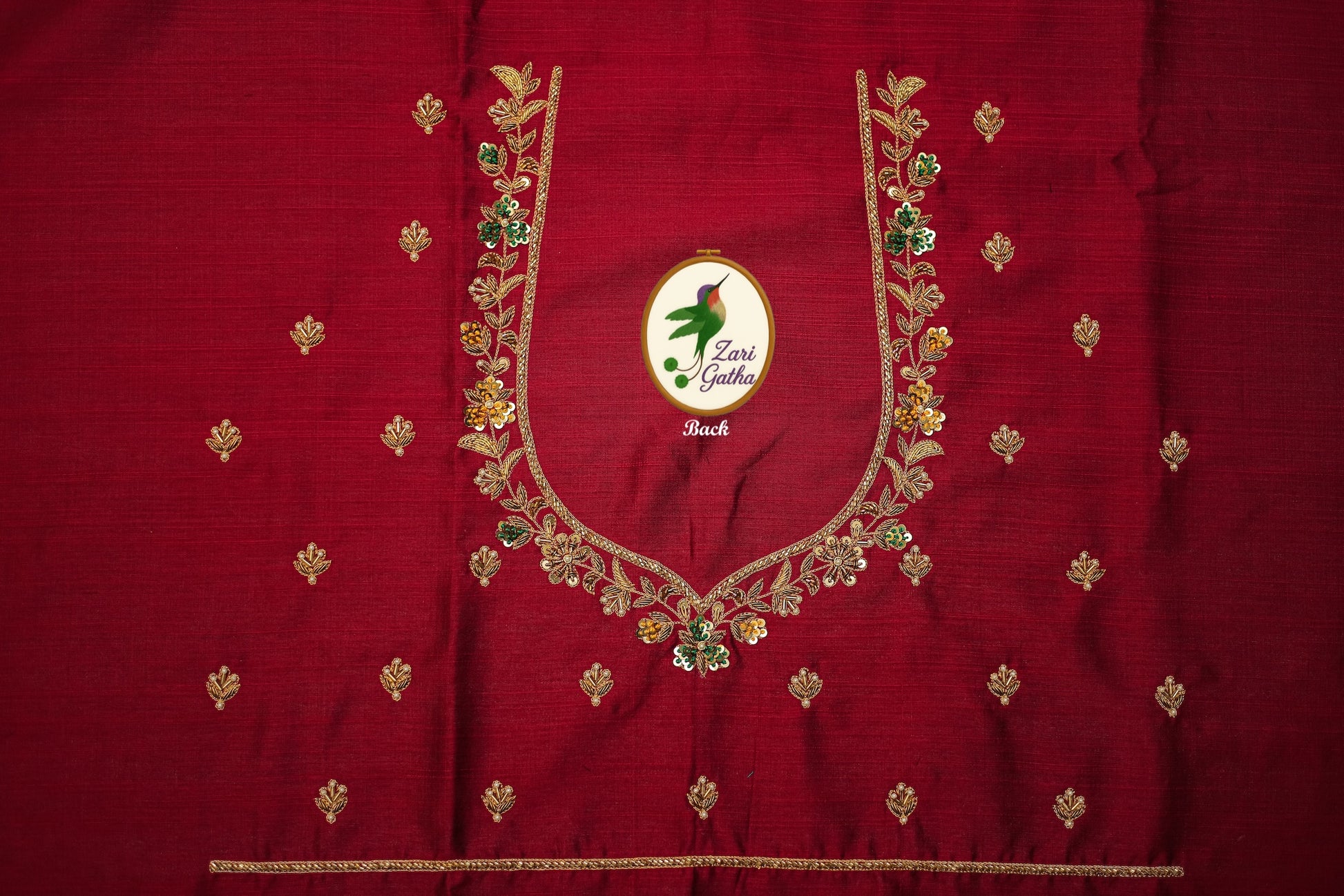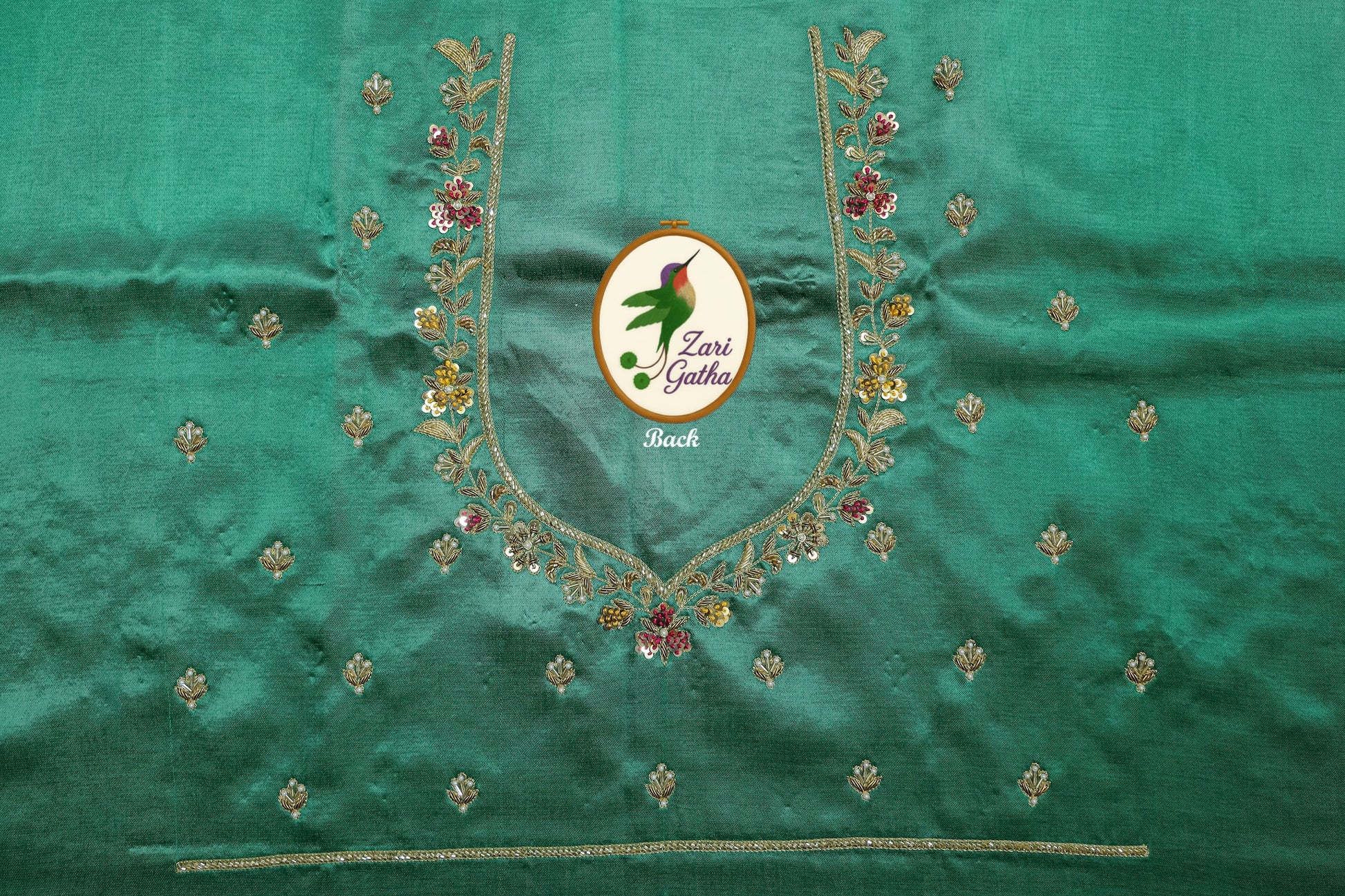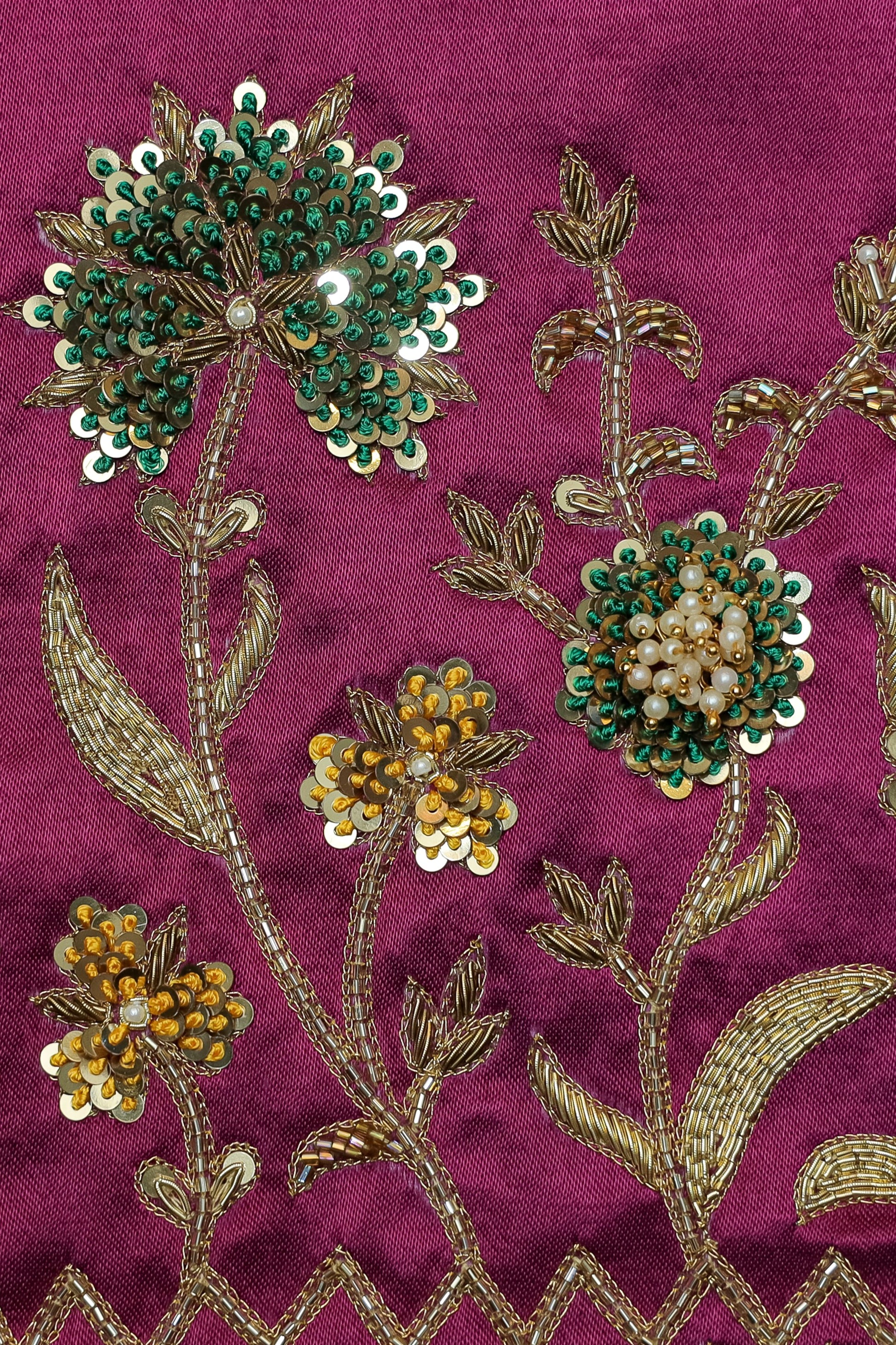 - Handcrafted embroidery with golden zari and beads